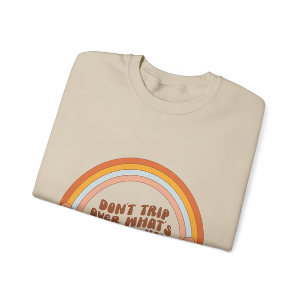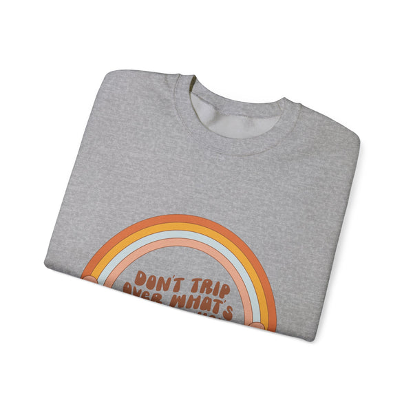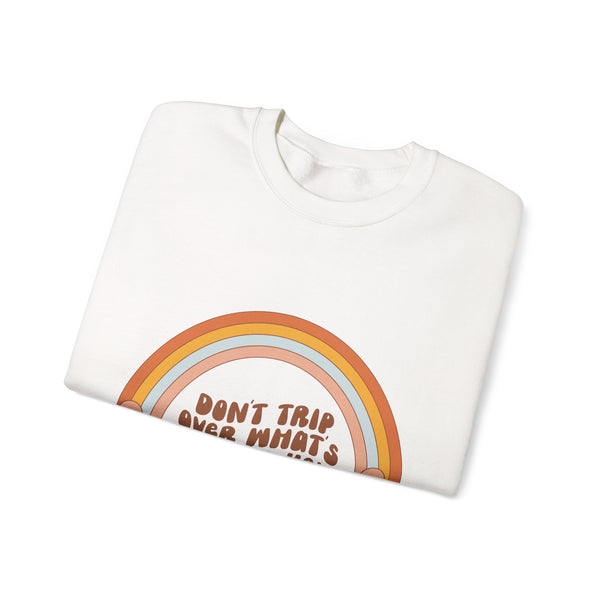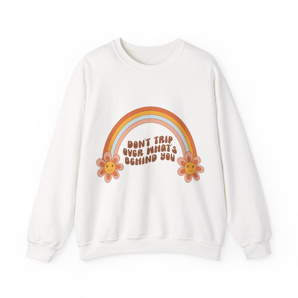 Step into positivity with our cozy sweatshirt featuring a vibrant rainbow design and a motivational message: 'Don't trip over what's behind you.' Embrace every moment with confidence and grace, letting go of the past and focusing on what lies ahead. Crafted for comfort and style, this sweatshirt is your perfect companion for chilly days and uplifting vibes. Wear it proudly and inspire others to keep moving forward with a smile.