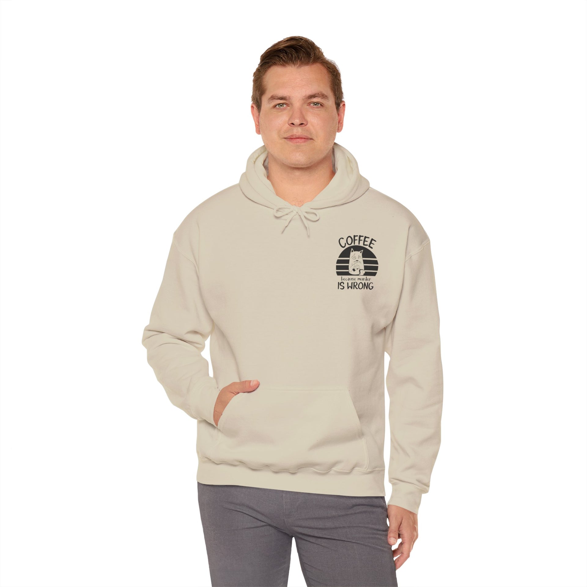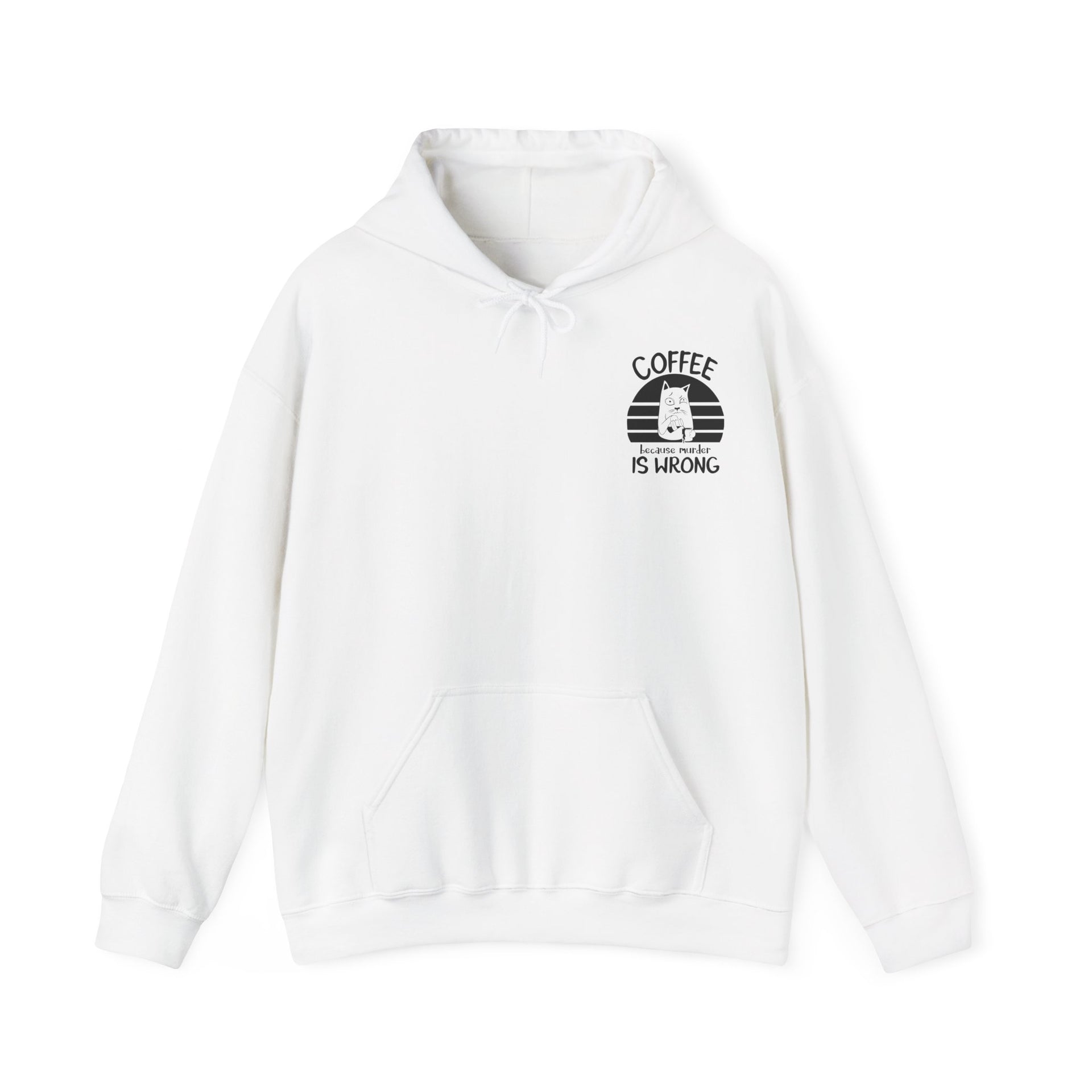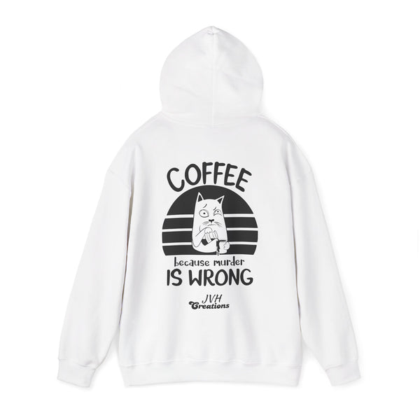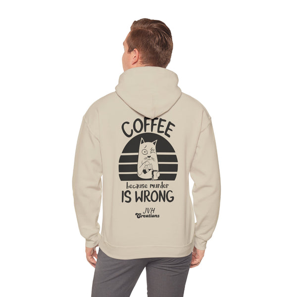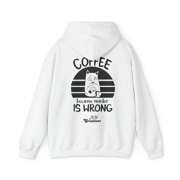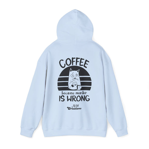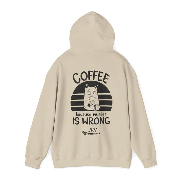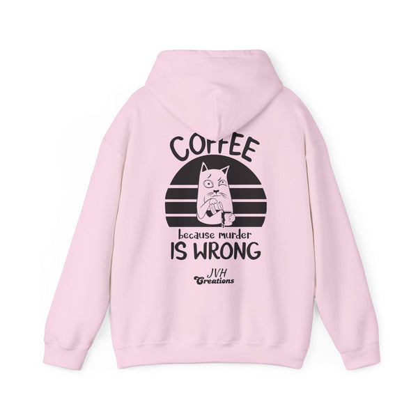 Snuggle up in our "Coffee because murder is wrong" Hoodie, the perfect blend of cozy and quirky. This hoodie features and adorably grumpy cat that mirrors your morning mood before that first sip of coffee. The witty caption, "Coffee because murder is wrong," adds a playful touch, reminding everyone that caffeine is your saving grace. Crafted from ultra-soft, warm fabric, this hoodie wraps you in comfort while letting your personality shine. Ideal for coffee lovers who appreciate a good laugh and a lot of warmth, this hoodie is your go-to for lady days and chilly mornings.