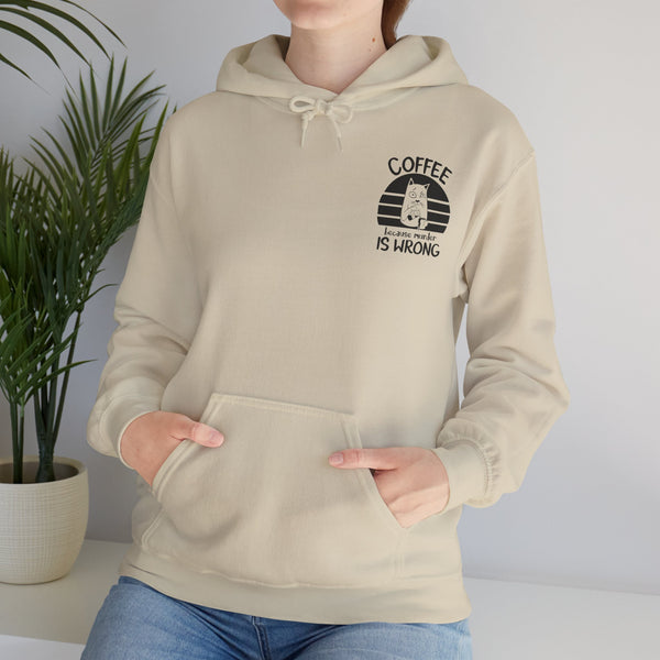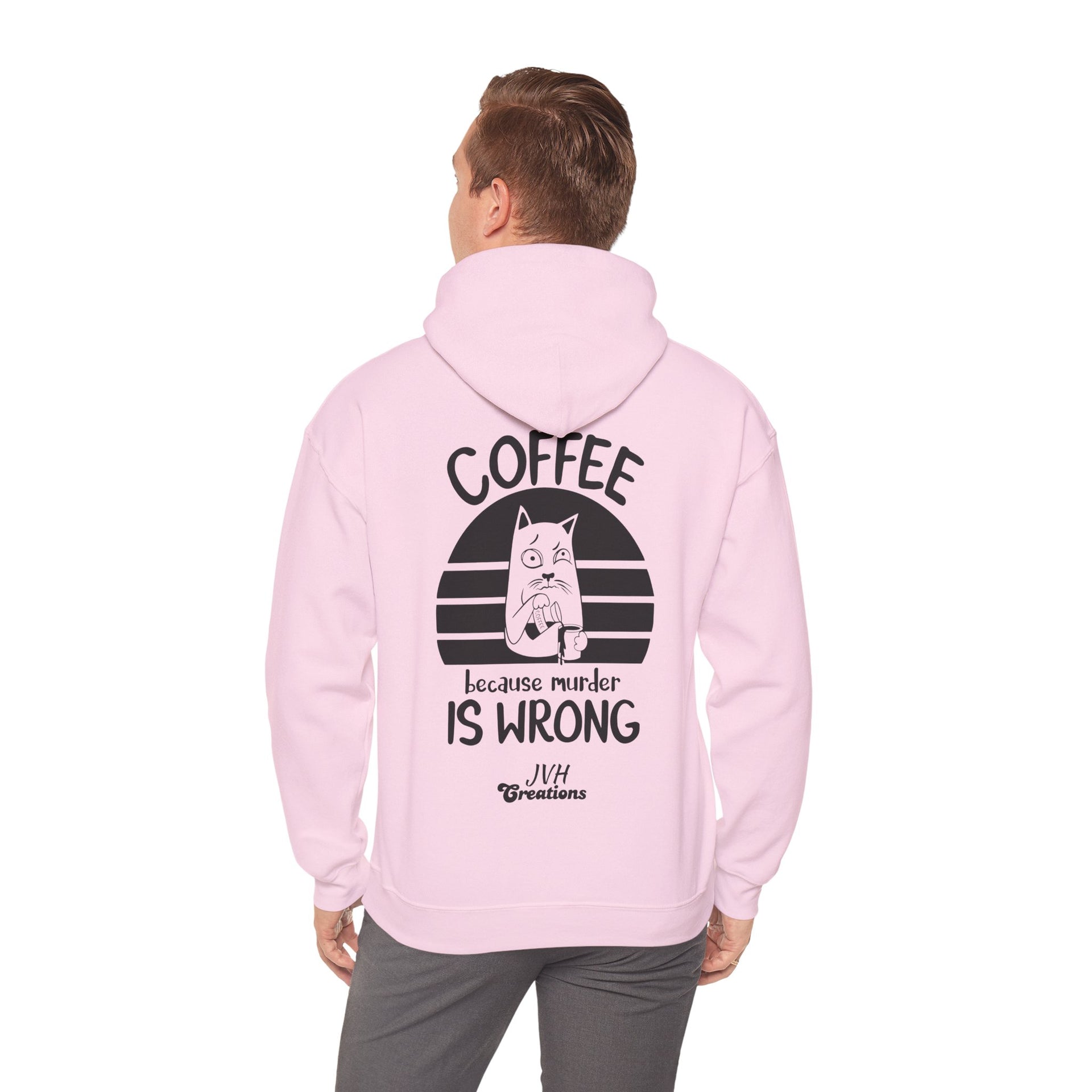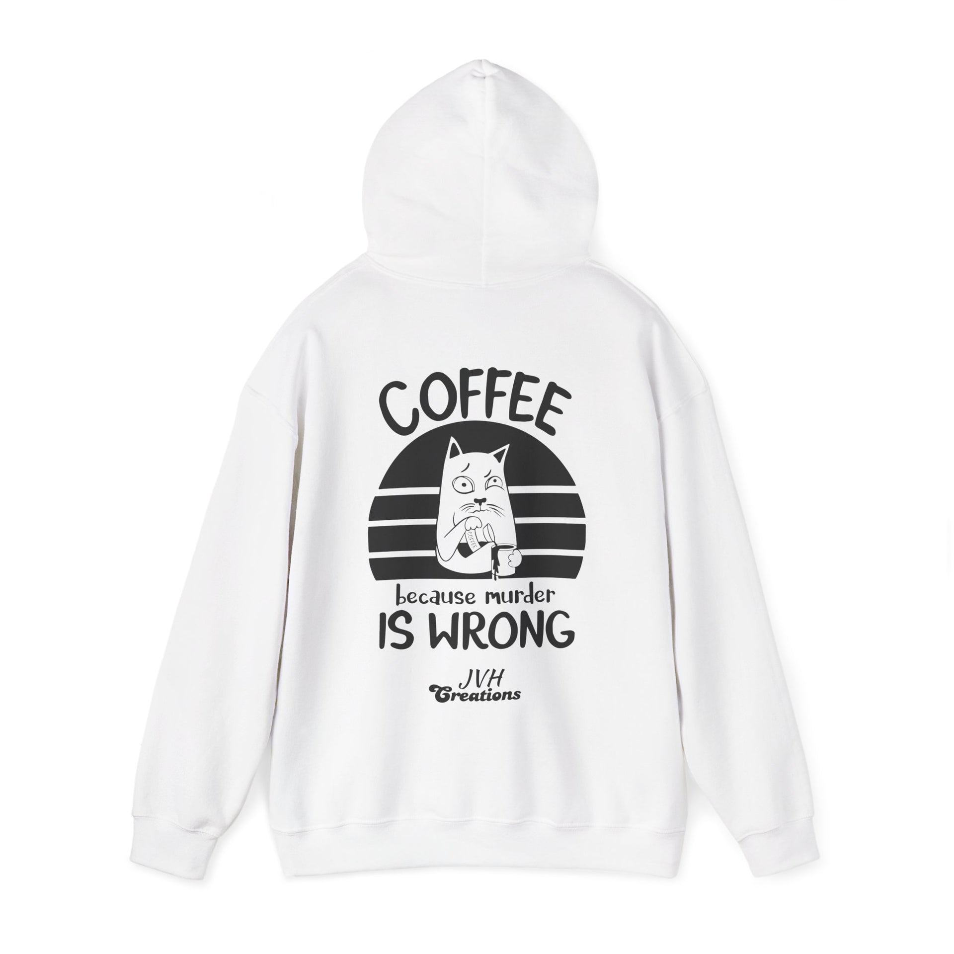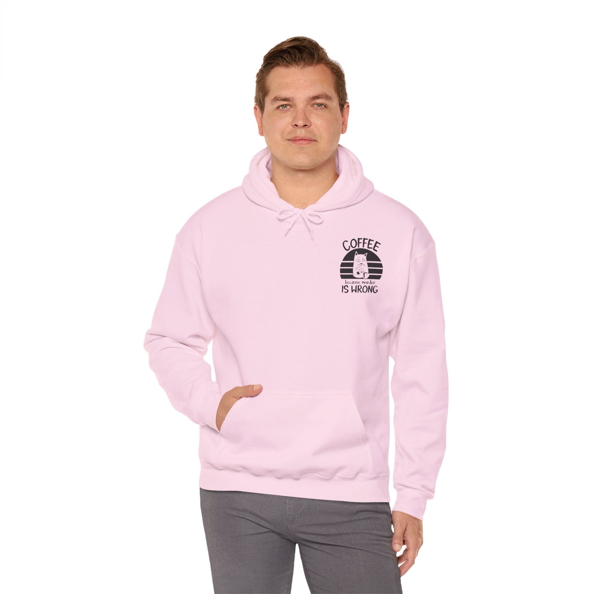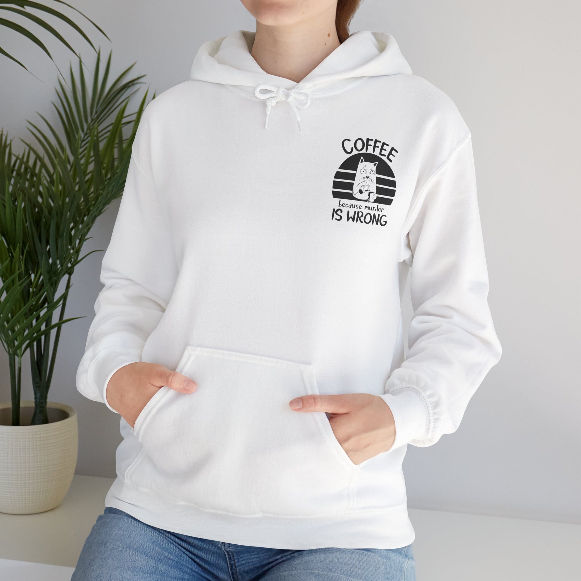 Snuggle up in our "Coffee because murder is wrong" Hoodie, the perfect blend of cozy and quirky. This hoodie features and adorably grumpy cat that mirrors your morning mood before that first sip of coffee. The witty caption, "Coffee because murder is wrong," adds a playful touch, reminding everyone that caffeine is your saving grace. Crafted from ultra-soft, warm fabric, this hoodie wraps you in comfort while letting your personality shine. Ideal for coffee lovers who appreciate a good laugh and a lot of warmth, this hoodie is your go-to for lady days and chilly mornings.